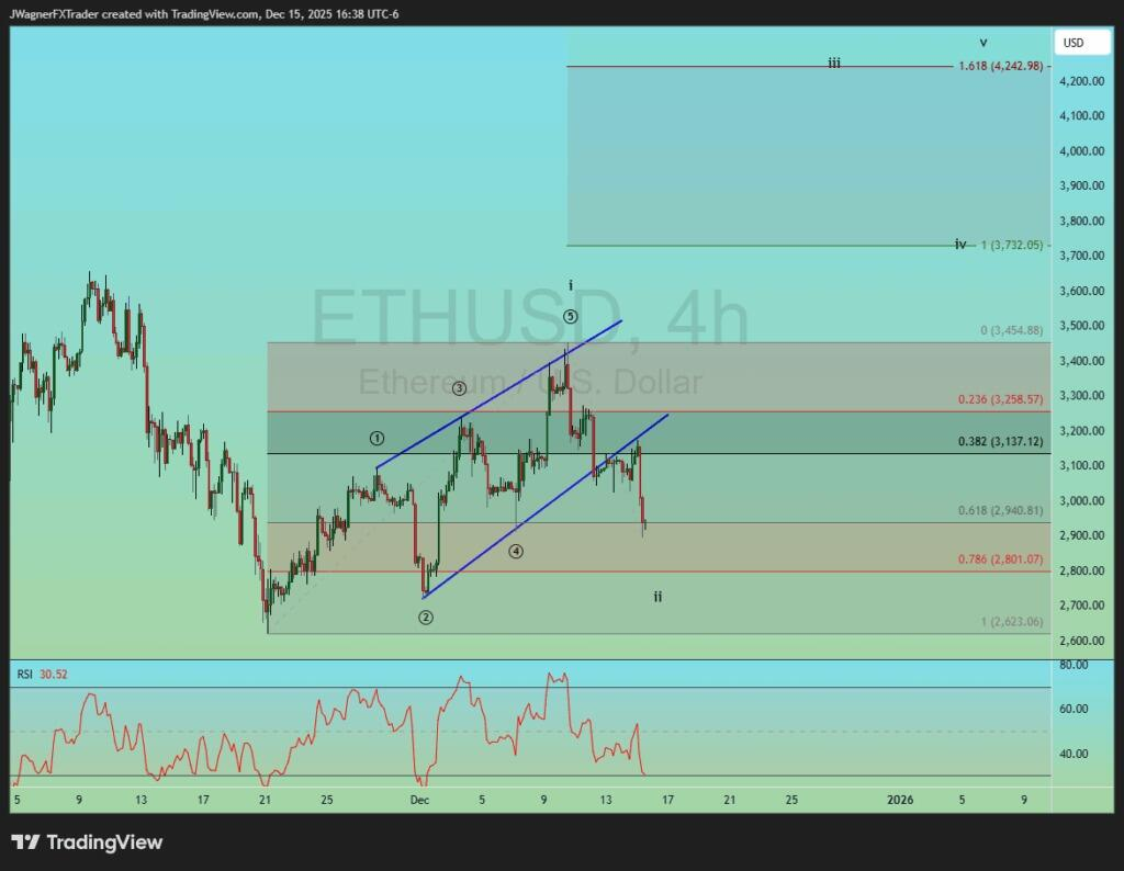 Giá Ethereum đang giảm trong một sóng Elliott II rõ ràng thuộc chuỗi 5 sóng lớn hơn.