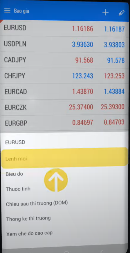 Để mở một lệnh trong ứng dụng MT5 trên điện thoại Android, bạn làm theo các bước sau: