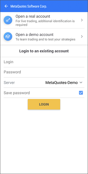 Sau khi ứng dụng MT5 dành cho Android đã được cài đặt thành công trên điện thoại của bạn, bạn có thể lựa chọn các hình thức sau: