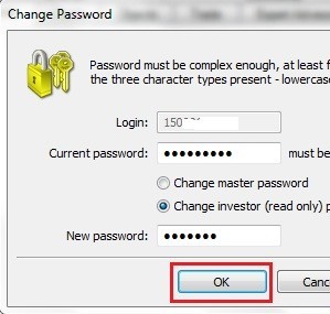 Đến bước này, bạn hãy chọn dòng Current password, bấm vào ô Change investor (read only) password rồi nhập vào mật khẩu mới, sau đó bấm OK và chờ hệ thống phản hồi. Các bạn bây giờ có thể dùng thông tin vừa thay để nhập vào Investor password ở trên.