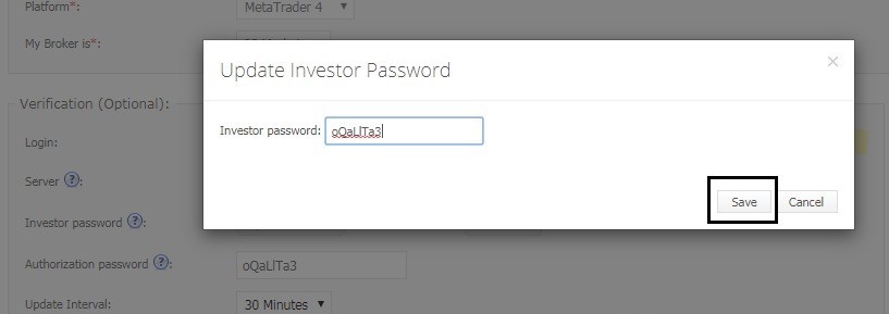 Đầu tiên, các bạn cần copy chuỗi mật khẩu này, sau đó thay đổi mật khẩu nhà đầu tư trên phần mềm MT4 rồi ấn vào phần Update Password, nhập mật khẩu mới vào, đây chính là Authorization password, rồi bấm Save.