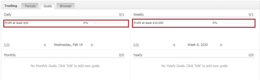 Bên cạnh đó, Myfxbook còn cho phép bạn đặt ra các mục tiêu lợi nhuận hàng ngày, hàng tuần, hàng tháng hoặc hàng năm và theo dõi các mục tiêu đó.