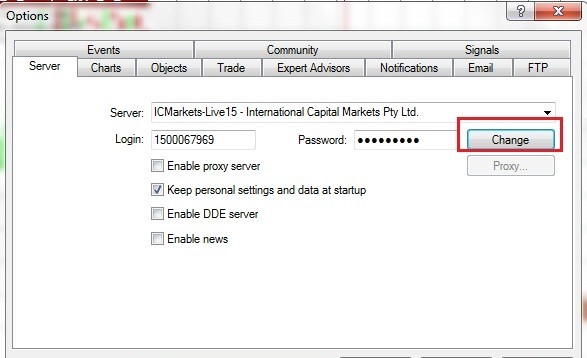 Khi sử dụng nền tảng MT4, các bạn hãy nhấn theo thứ tự như sau Tools rồi đến Options rồi đến Server rồi đến Change.
