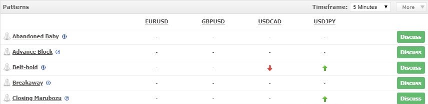 Patterns: Đây là chức năng mà Myfxbook sẽ giúp các bạn tiến hành quét và phát hiện diễn biến của các mẫu (mô hình nến, mô hình giá) theo thời gian thực. Đồng thời, Patterns đưa ra các dự báo về hướng biến động của giá thông qua các mẫu đó. Tại đây, các bạn hoàn toàn có thể có ví dụ trực quan để tìm hiểu về khái niệm, ý nghĩa và cách giao dịch của từng mẫu mô hình hoàn toàn miễn phí.