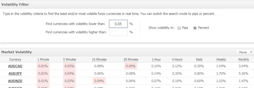 Volatility: Chức năng này giúp tự động phân tích biến động trên từng tài sản cụ thể theo thời gian thực. Công cụ này sẽ chỉ ra được những chỉ số về giá của các loại tài sản trên thị trường đang thay đổi bao nhiêu pip hoặc bao nhiêu phần trăm, giao độ thế nào. Các bạn hoàn toàn có thể lọc số liệu để tìm ra các tài sản đang biến động trong phạm vi tùy chỉnh.