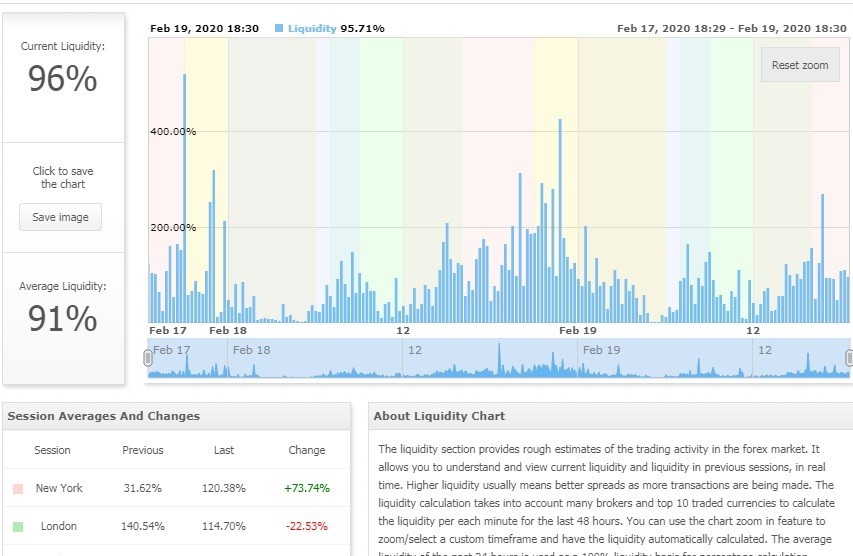 Liquidity: Đây là công cụ sẽ ước tính sơ bộ về hoạt động giao dịch trên thị trường ngoại hối theo thời gian thực. Liquidity dựa vào những biến động trong giao thức để chỉ ra cho các nhà đầu tư tính thanh khoản của thị trường hiện tại so với các phiên giao dịch trước trong 48 giờ trở lại. Công cụ này sẽ giúp các nhà đầu tư đứng trên cương vị một nhà phân tích số liệu, xem xét tính thanh khoản của thị trường hiện tại để ra quyết định có nên giao dịch trong thời gian này hay không.