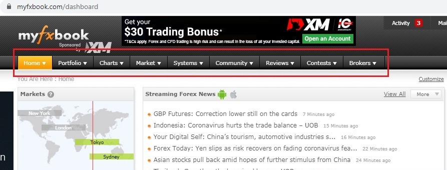 Tại trang chủ của Myfxbook, các bạn sẽ nhìn thấy các nội dung trên thanh Menu. Đây cũng chính là những dịch vụ, công cụ mà các bạn sẽ được trải nghiệm trên nền tảng này để phục vụ quá trình trading Forex.