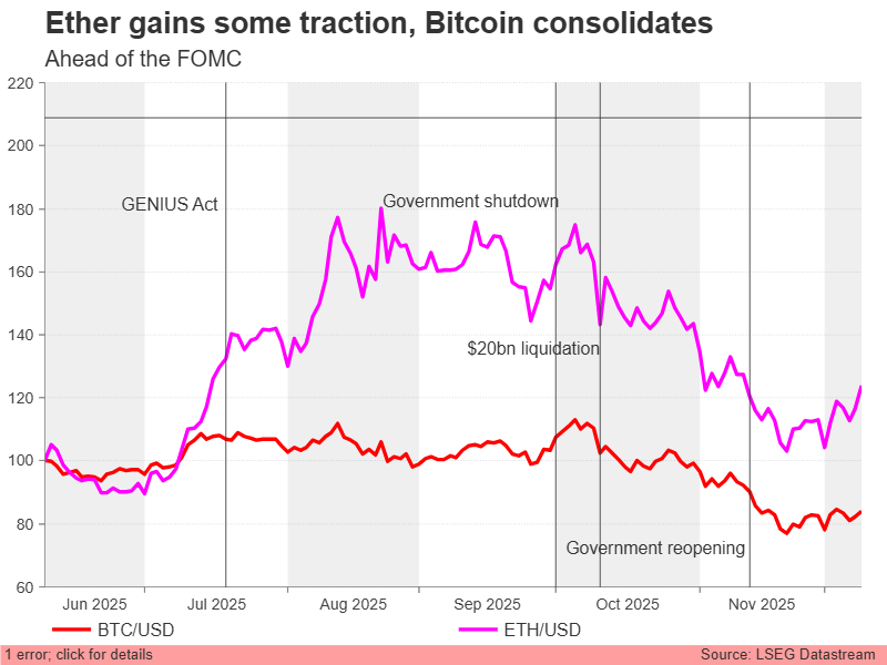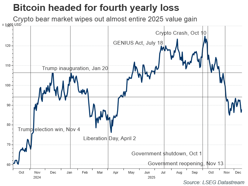Trong chốc lát, "thị trường tiền điện tử đã đạt được mọi thứ mình muốn", nhưng tâm lý thị trường nhanh chóng xấu đi. Đà tăng từ 94.937 đô la vào ngày 1 tháng 1 lên đỉnh điểm 126.163 đô la vào ngày 6 tháng 10 bất chấp sự sụt giảm xuống còn 74.470 đô la vào ngày 2 tháng 4 do thuế quan đã sụp đổ sau khi chính phủ đóng cửa 42 ngày làm đình trệ các dự luật quan trọng và sự xóa sổ thanh lý trị giá 20 tỷ đô la sau các mối đe dọa thuế quan vào ngày 10 tháng 10. Bitcoin đã giảm xuống còn 80.500 đô la vào cuối tháng 11 trước khi ổn định ở mức gần 90.000 đô la vào đầu tháng 12, và tổng vốn hóa thị trường đã giảm hơn một nghìn tỷ đô la, xuống còn 3,1 tỷ đô la vào cuối năm.