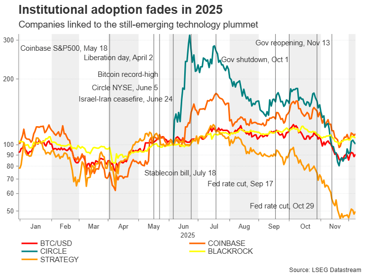 Các nhà đầu tư nhận ra rằng việc nắm giữ token kỹ thuật số không tạo ra lợi nhuận, khiến nhiều công ty quản lý tài sản kỹ thuật số (DAT) gặp khó khăn trong việc trả nợ cho các thương vụ mua lại. Ngay cả công ty hàng đầu trong lĩnh vực này, Strategy Inc. của Michael Saylor, với 60 tỷ đô la Bitcoin, cũng chứng kiến giá cổ phiếu giảm xuống dưới giá trị tài sản ròng vào tháng 11 - giảm hơn 60% so với tháng 7. Hiện công ty đang đối mặt với nguy cơ bị loại khỏi chỉ số MSCI trước ngày 15 tháng 1, điều này có thể gây ra dòng vốn chảy ra lên tới 8,8 tỷ đô la nếu các nhà cung cấp chỉ số khác cũng làm theo.