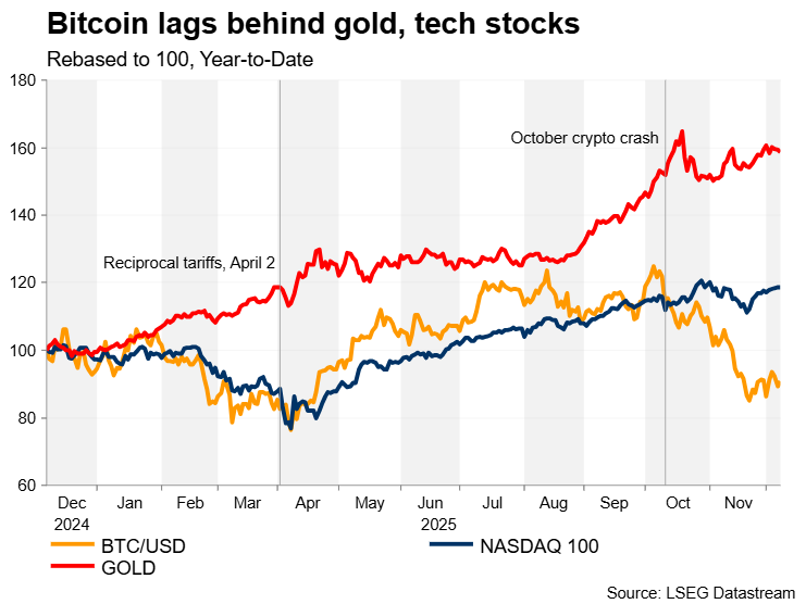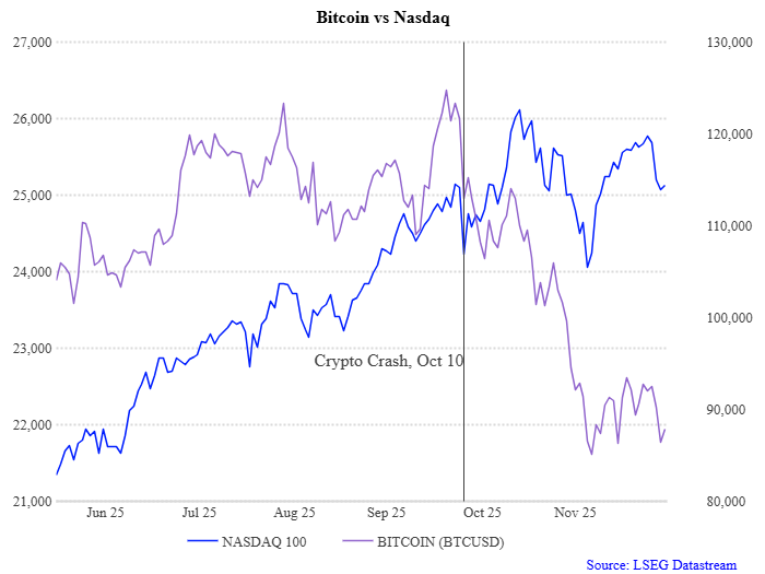 Mặc dù Bitcoin trong lịch sử thường tăng giá cùng với cổ phiếu trong các chu kỳ nới lỏng tiền tệ, mối quan hệ đó đã bị phá vỡ trong năm nay, đặc biệt là sau sự sụp đổ của tiền điện tử vào tháng 10 (như minh họa trong biểu đồ). Theo dữ liệu do Bloomberg tổng hợp, tài sản tiền điện tử lớn nhất đã tụt hậu trong phần lớn nửa cuối năm và thậm chí còn giảm trong hai lần cắt giảm lãi suất cuối cùng của Fed, khiến nó đi đúng hướng để tạo ra sự tách biệt rõ rệt nhất so với cổ phiếu trong một thập kỷ.