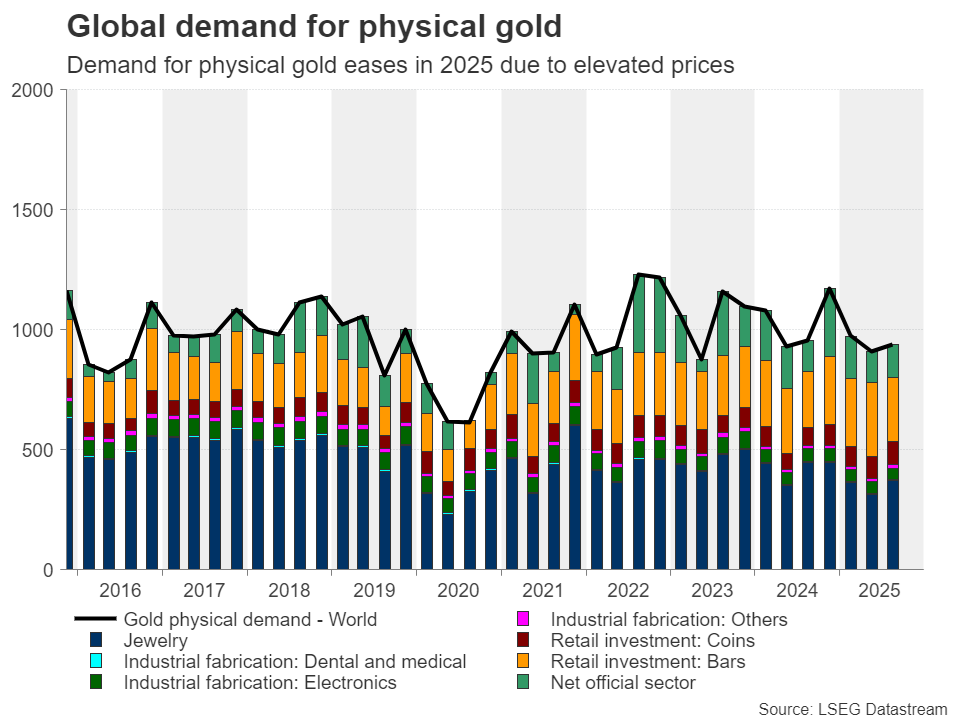Hơn nữa, khi giá vàng liên tục tăng cao chưa từng thấy trong năm 2025, Ấn Độ đã chứng kiến sự sụt giảm mạnh về nhu cầu trang sức. Mặc dù người dân dường như đã chuyển sang các hình thức nắm giữ vàng hướng đến đầu tư, chẳng hạn như ETF và các sản phẩm vàng giấy tờ khác, nhưng tổng nhu cầu vàng của quốc gia này vẫn giảm 16% trong quý 3 năm 2025. Tình hình toàn cầu cũng phản ánh xu hướng này. Theo Hội đồng Vàng Thế giới, tiêu thụ trang sức trên toàn thế giới đã giảm mạnh 31% so với cùng kỳ năm trước, ngay cả khi nhu cầu đầu tư vẫn mạnh mẽ và các ngân hàng trung ương vẫn mua vào nhiều. Do đó, tổng nhu cầu chỉ tăng 3% so với cùng kỳ năm trước trong quý 3.