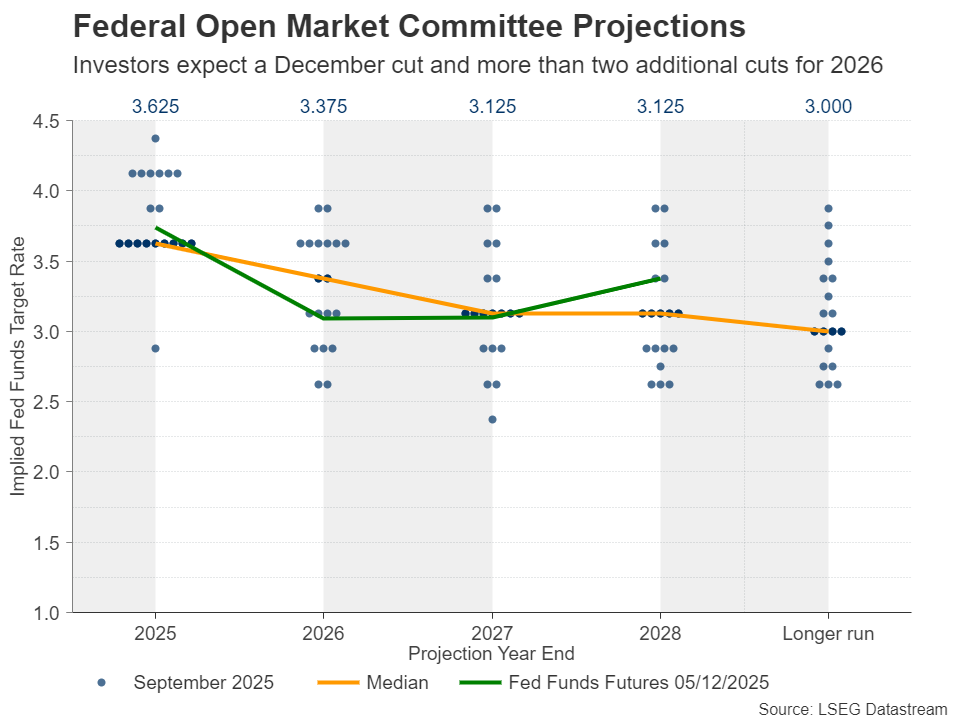 Mặc dù xác suất giảm lãi suất lần thứ ba liên tiếp vào tháng 12 ban đầu thấp sau cuộc họp tháng 10, nhưng sự suy yếu được bộc lộ trong dữ liệu bị trì hoãn – do chính phủ Mỹ đóng cửa kết hợp với các tín hiệu ôn hòa từ các nhà hoạch định chính sách chủ chốt, bao gồm cả Chủ tịch Fed New York có ảnh hưởng lớn John Williams, đã đẩy xác suất đó lên khoảng 85%. Nhìn về năm 2026, thị trường vẫn đang dự báo khoảng 60 điểm cơ bản nới lỏng thêm, tương đương với hai lần cắt giảm 0,25 điểm phần trăm và xác suất 50/50 cho lần cắt giảm thứ ba.
