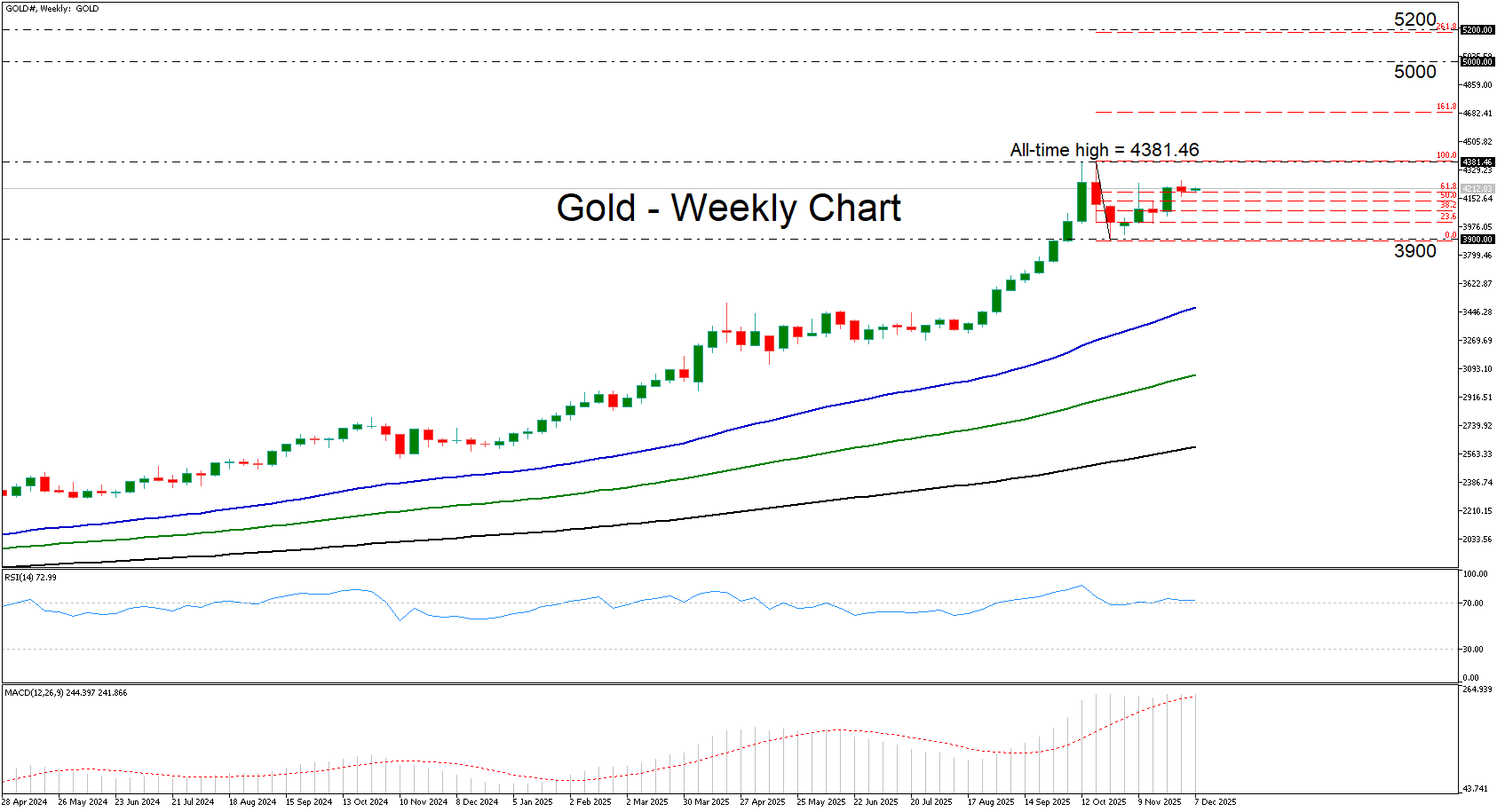 Nhìn chung, các yếu tố đã thúc đẩy giá vàng đạt mức cao kỷ lục liên tiếp trong năm 2025 vẫn đang hiện hữu, cho thấy kim loại quý này có thể tiếp tục xu hướng tăng giá trong những tháng đầu năm, hoặc thậm chí là nửa đầu năm 2026. Phe mua có thể nhắm đến mốc 5.000 đô la hoặc vùng giá 5.200 đô la, nằm gần mức mở rộng Fibonacci 261,8% của đợt điều chỉnh từ ngày 20-28 tháng 10.