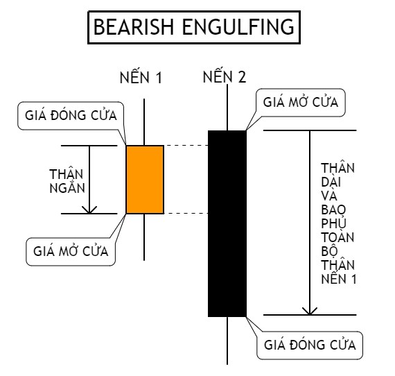 - Mô hình này bao gồm hai nến có nến đầu tiên là nến tăng và nến thứ hai là nến giảm có thân phải bao phủ (nhấn chìm) toàn bộ thân của cây nến thứ nhất.
