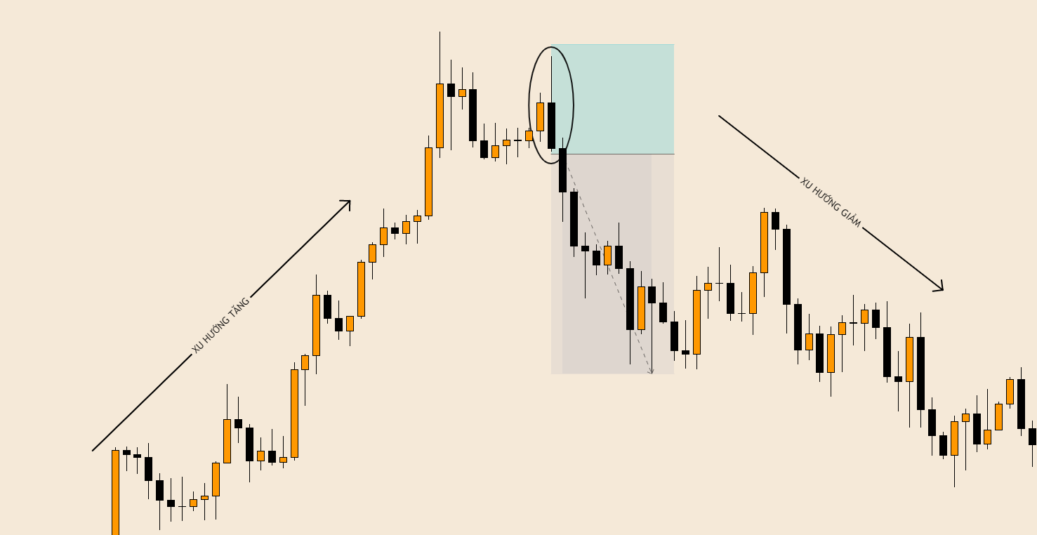 - Xu hướng chính đang là xu hướng tăng, tuy nhiên sau những cây nến tăng mạnh thì thị trường có dấu hiệu chững lại khi xuất hiện một đoạn giá gồm nhiều nến lưỡng lự, điều này chứng tỏ xu hướng tăng đã suy yếu dần.
