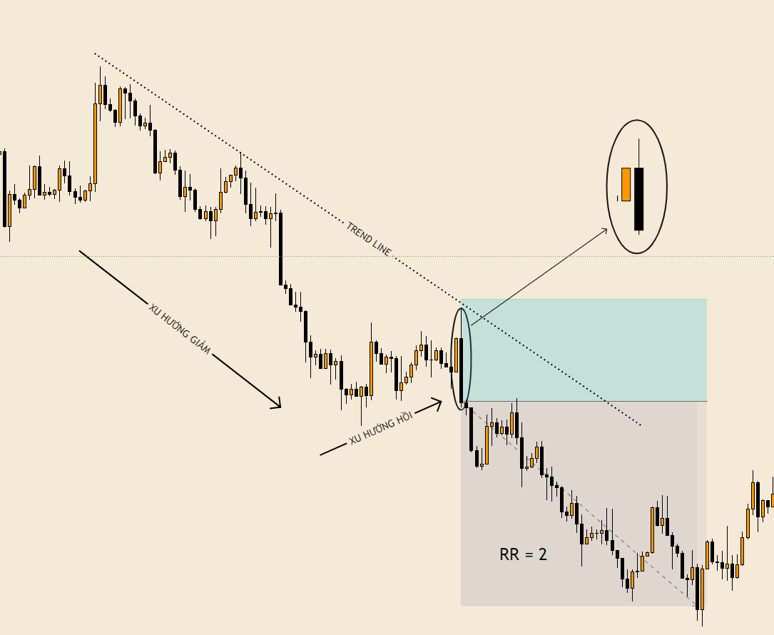 - Nến 1 phải là nến tăng (thân nến màu cam). Đặc điểm nhận dạng là có phần thân tương đối ngắn và không quan trọng độ dài của râu nến.