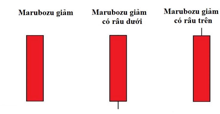 Nến Marubozu giảm (Bearish Marubozu) là mẫu hình nến có mức giá đóng cửa thấp hơn mức giá mở cửa bao gồm các biến thể sau: