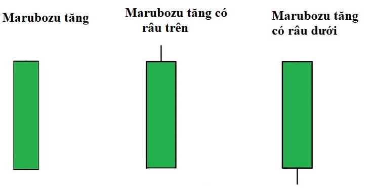 Nến Marubozu tăng (Bullish Marubozu) là mô hình nến biểu thị giá đóng cửa cao hơn giá mở cửa. Điều này cho thấy bên mua đang kiểm soát thị trường. Mẫu hình nến Marubozu này có 3 biến thể sau: