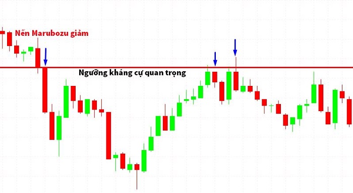 - Ngưỡng kháng cự hình thành tại mức giá cao nhất của nến giảm (Bearish Marubozu). Điều này có nghĩa khi Marubozu giảm, thị trường đi xuống, giá mở cửa (giá cao nhất) sẽ tạo thành ngưỡng kháng cự.