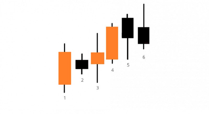 - Bóng nến ngắn (cả bóng trên và bóng dưới – nến số 4): Cho thấy giao dịch được giới hạn gần giá mở cửa và giá đóng cửa của phiên, cho thấy không có sự giằng co mạnh mẽ nào giữa hai bên mua và bán, giá đang đi theo hướng của bên chiếm ưu thế.