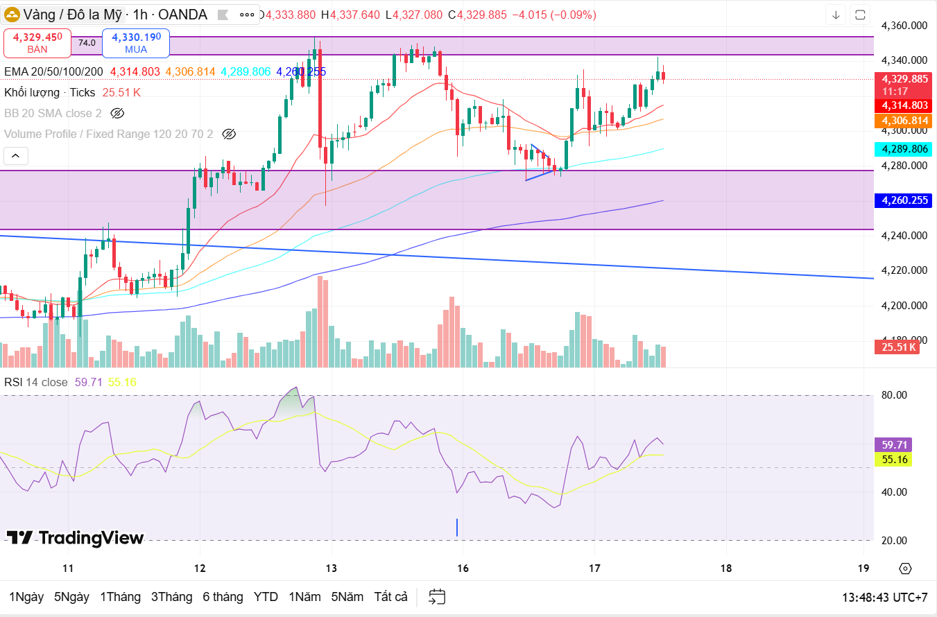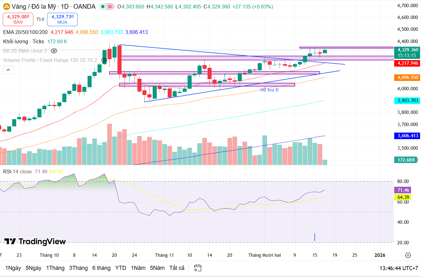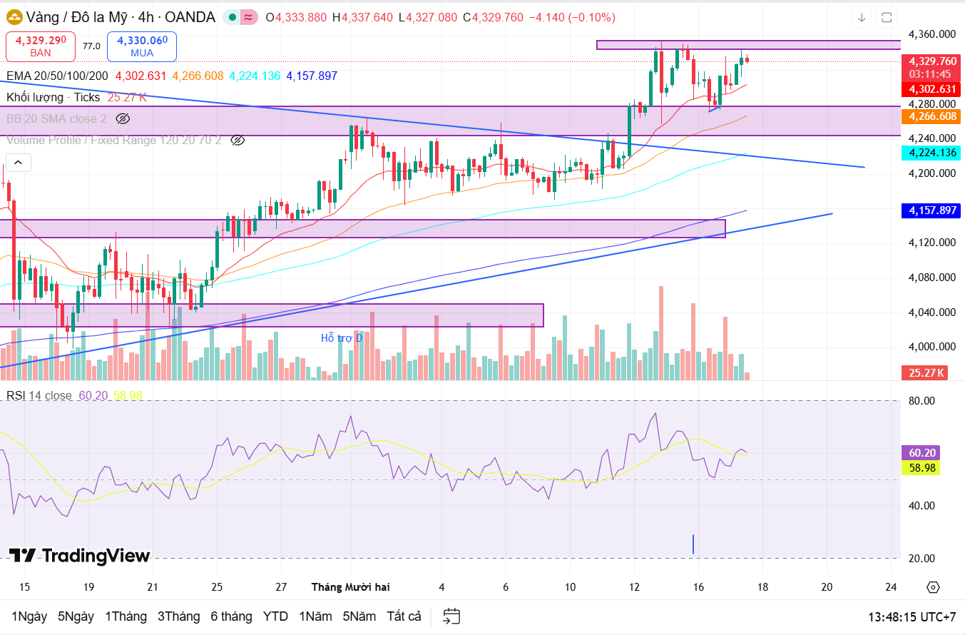 Trên khung ngày, XAUUSD vẫn duy trì cấu trúc tăng trung hạn khi giá liên tục tạo đáy cao dần và đang vận động phía trên các đường EMA quan trọng. Sau nhịp điều chỉnh mạnh trong tháng 11, vàng đã hồi phục khá tốt và hiện quay trở lại vùng kháng cự then chốt quanh 4,340 – 4,3450.