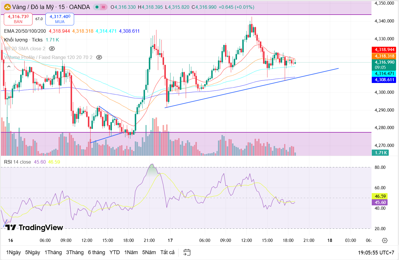 Ở khung 15 phút, giá đang có dấu hiệu điều chỉnh nhẹ sau khi thất bại trong việc duy trì trên vùng đỉnh gần nhất. Các nhịp giảm hiện tại chủ yếu mang tính kỹ thuật, khi giá vẫn giữ trên các EMA trung hạn và chưa phá vỡ cấu trúc tăng ngắn hạn.