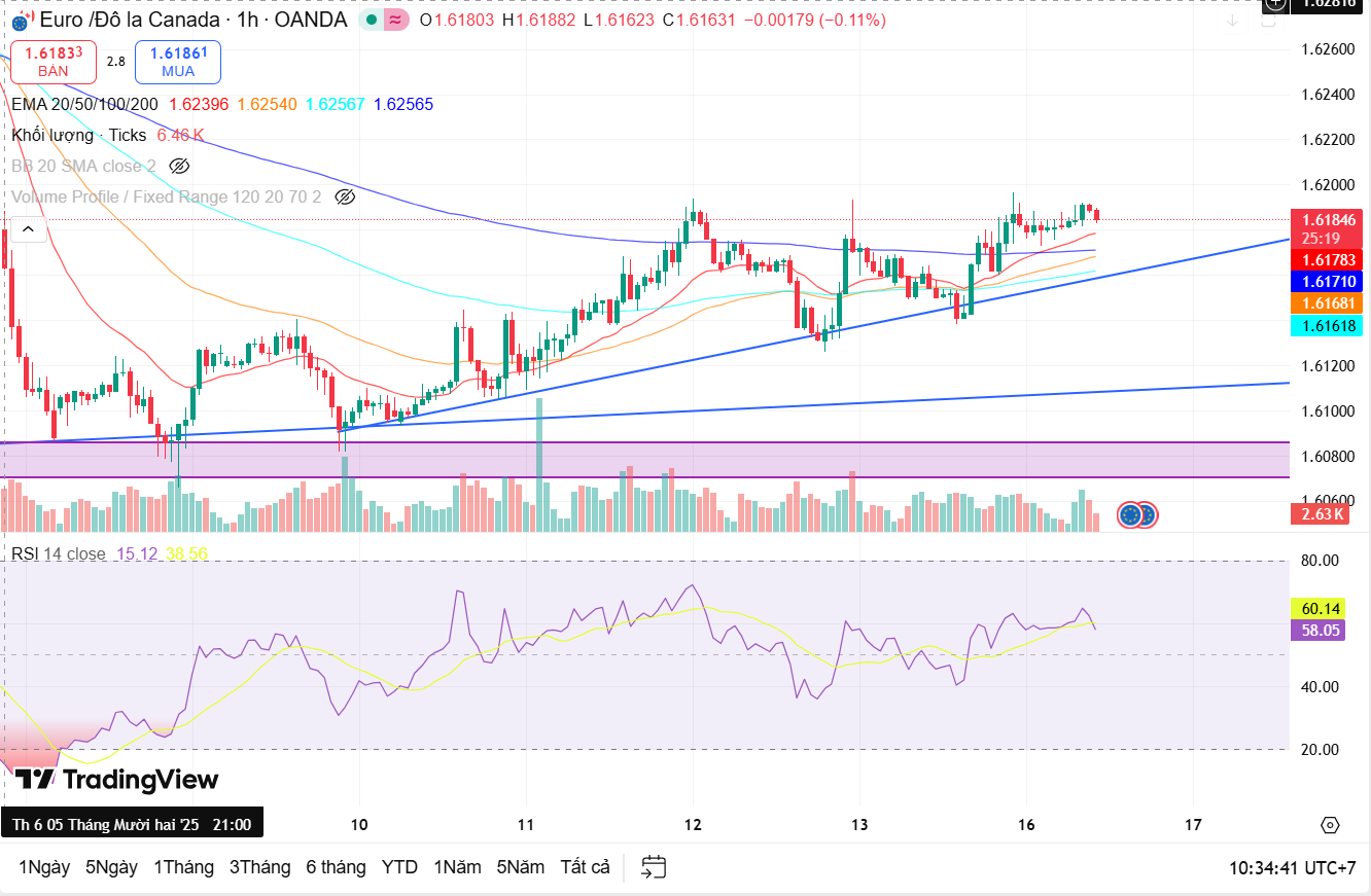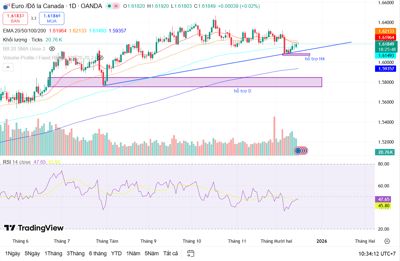Trên khung ngày, EUR/CAD vẫn duy trì xu hướng tăng trung hạn khi giá nằm phía trên EMA200 và đường trendline tăng dài hạn. Tuy nhiên, đà tăng đã chậm lại rõ rệt trong thời gian gần đây khi giá liên tục bị chặn bởi cụm EMA20–50, phản ánh trạng thái tích lũy – điều chỉnh trong xu hướng tăng. RSI dao động quanh vùng trung tính 45–50, cho thấy thị trường chưa có động lực rõ ràng để bứt phá ngay. Vùng hỗ trợ đáng chú ý nằm quanh 1.595 – 1.600, đóng vai trò là nền giá quan trọng của khung ngày.