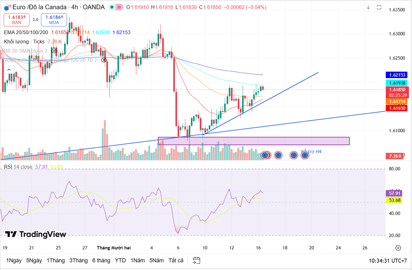 Ở khung H4, giá đã có nhịp phục hồi từ vùng hỗ trợ thấp hơn nhưng hiện đang tiếp cận vùng kháng cự động EMA100–200 quanh khu vực 1.619–1.622. Cấu trúc giá cho thấy xu hướng tăng ngắn hạn đabg được hình thành, tuy nhiên biên độ đang thu hẹp dần, hàm ý rủi ro xuất hiện nhịp điều chỉnh kỹ thuật nếu lực mua không đủ mạnh. RSI H4 duy trì trên 50, nghiêng nhẹ về phe mua nhưng chưa bước vào trạng thái quá mua.