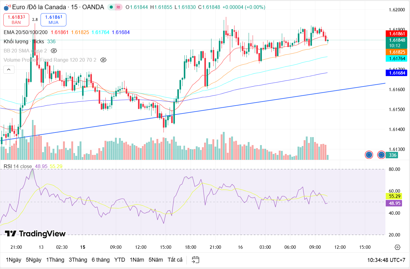 Trên khung M15, giá đang điều chỉnh nhẹ sau nhịp tăng trước đó và có xu hướng test lại EMA20–50. Nếu vùng này giữ vững, EUR/CAD có thể tiếp tục nhịp hồi theo xu hướng chính. Ngược lại, việc phá vỡ EMA và trendline ngắn hạn có thể kích hoạt nhịp điều chỉnh sâu hơn về các vùng hỗ trợ thấp hơn trong ngày.