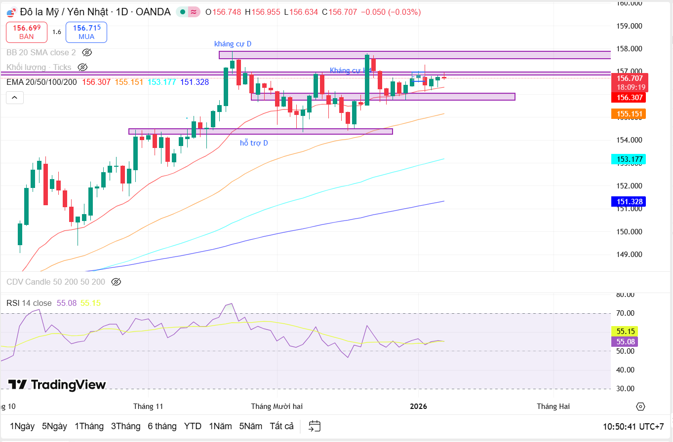 Trên khung ngày, xu hướng tăng trung hạn vẫn được duy trì, thể hiện qua việc giá tiếp tục nằm trên EMA50 – EMA100 – EMA200, đồng thời cấu trúc higher low vẫn chưa bị phá vỡ. Tuy nhiên, cần lưu ý rằng USD/JPY đang bị chặn rõ rệt bởi vùng kháng cự D quanh 157.2 – 157.8, nơi trước đó đã nhiều lần xuất hiện lực bán mạnh.