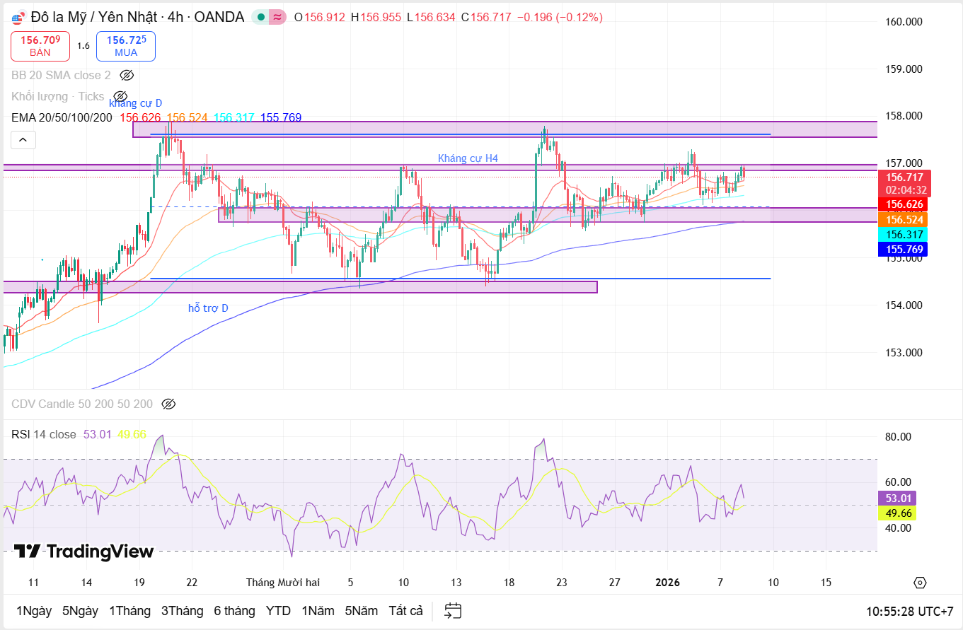 Ở H4, cấu trúc thị trường khá rõ: giá đang dao động trong biên độ 155.7 – 157.0, đúng kiểu range nghiêng tăng. EMA20/50/100/200 hội tụ và xếp tương đối gọn, cho thấy thị trường đang cân bằng cung – cầu, thiếu động lực xu hướng mạnh.