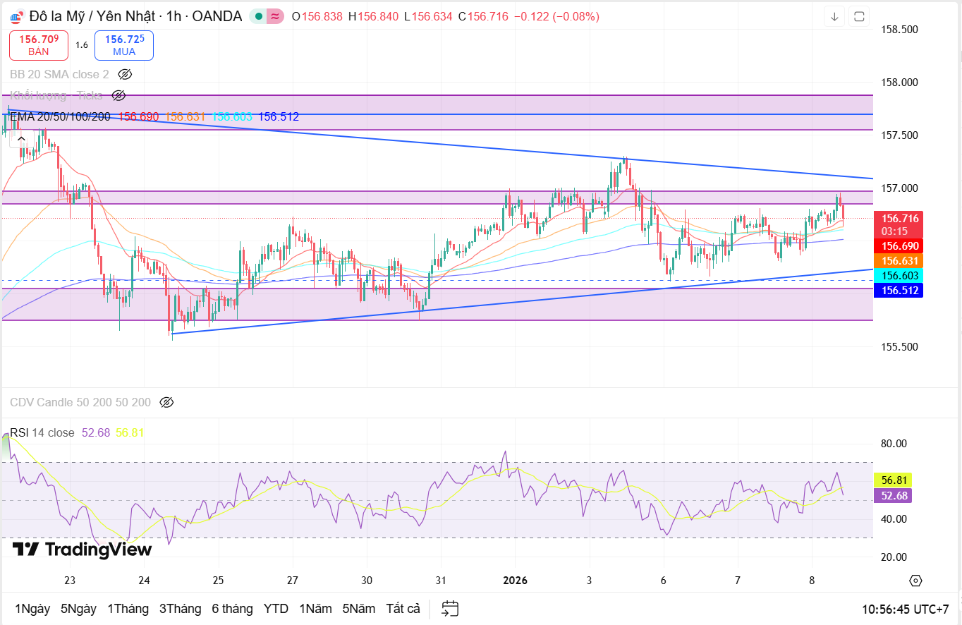 Trên H1, giá đang di chuyển trong kênh tăng nhẹ, nhưng liên tục thất bại khi tiếp cận vùng 157.0 – 157.2 (kháng cự H1). Sau mỗi lần bị từ chối, giá quay về kiểm tra lại EMA100–200 quanh 156.5 – 156.6.