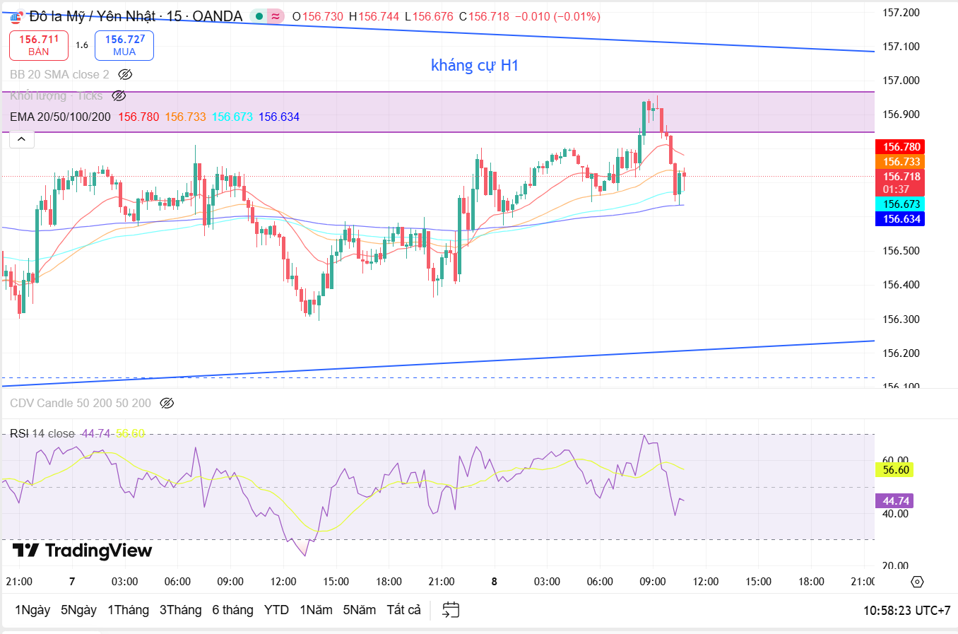 Khung M15 cho thấy nhịp điều chỉnh ngắn hạn vẫn còn, khi RSI rơi xuống dưới 45 và giá tạm thời nằm dưới EMA20–50. Tuy nhiên, vùng 156.6 ± đang phát huy vai trò hỗ trợ intraday khá tốt, với nhiều lần rút chân trở lại.