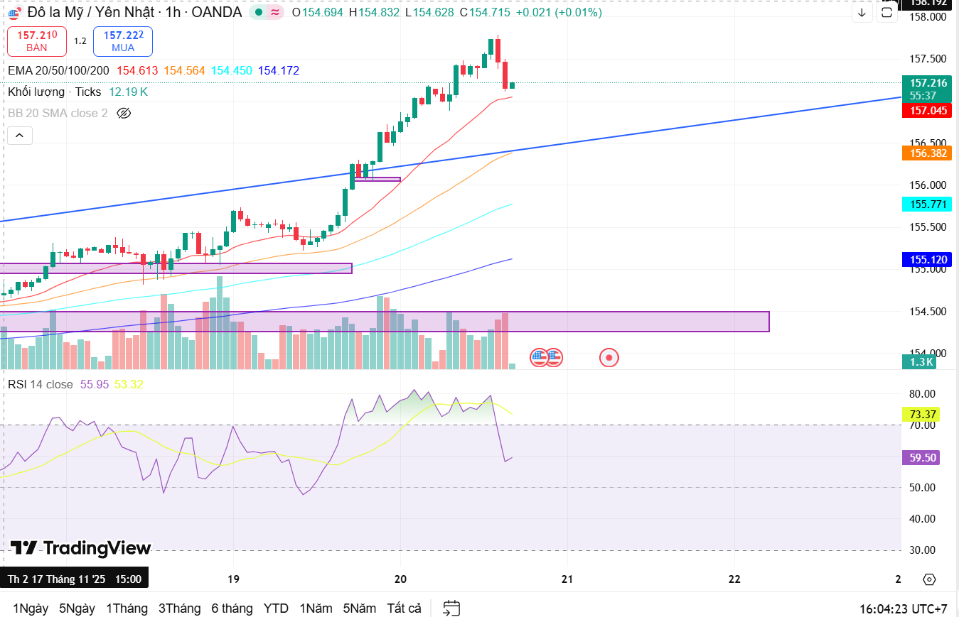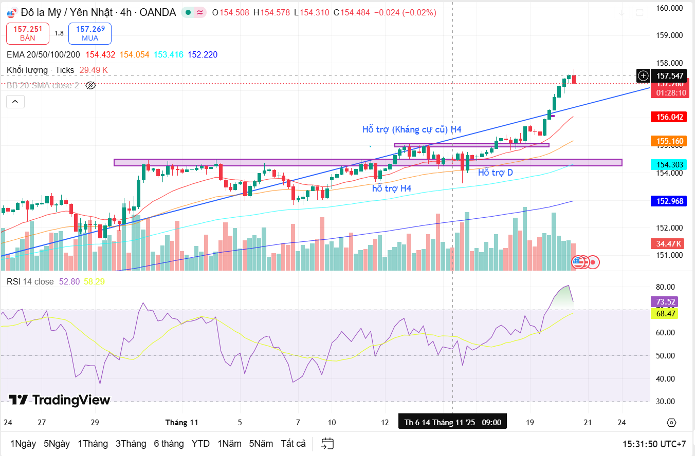 Tại thời điểm bài viết được soạn, tỷ giá USD/JPY đang neo quanh 157, ghi nhận tăng mạnh so với phiên ngày hôm qua. Nhìn tổng quan vào cấu trúc đa khung thời gian của cặp USD/JPY, thị trường đang thể hiện sự đồng pha hoàn hảo về xu hướng tăng (Bullish) trên cả biểu đồD1 và 4 giờ H4, với cấu trúc đỉnh đáy sau cao hơn được duy trì vững chắc. Đây là tin vui cho các Độ bền vững của đà tăng này được cũng cố bởi độ phân tách của các đường EMA và khối lượng được duy trì ở mức lớn của các vùng tích.