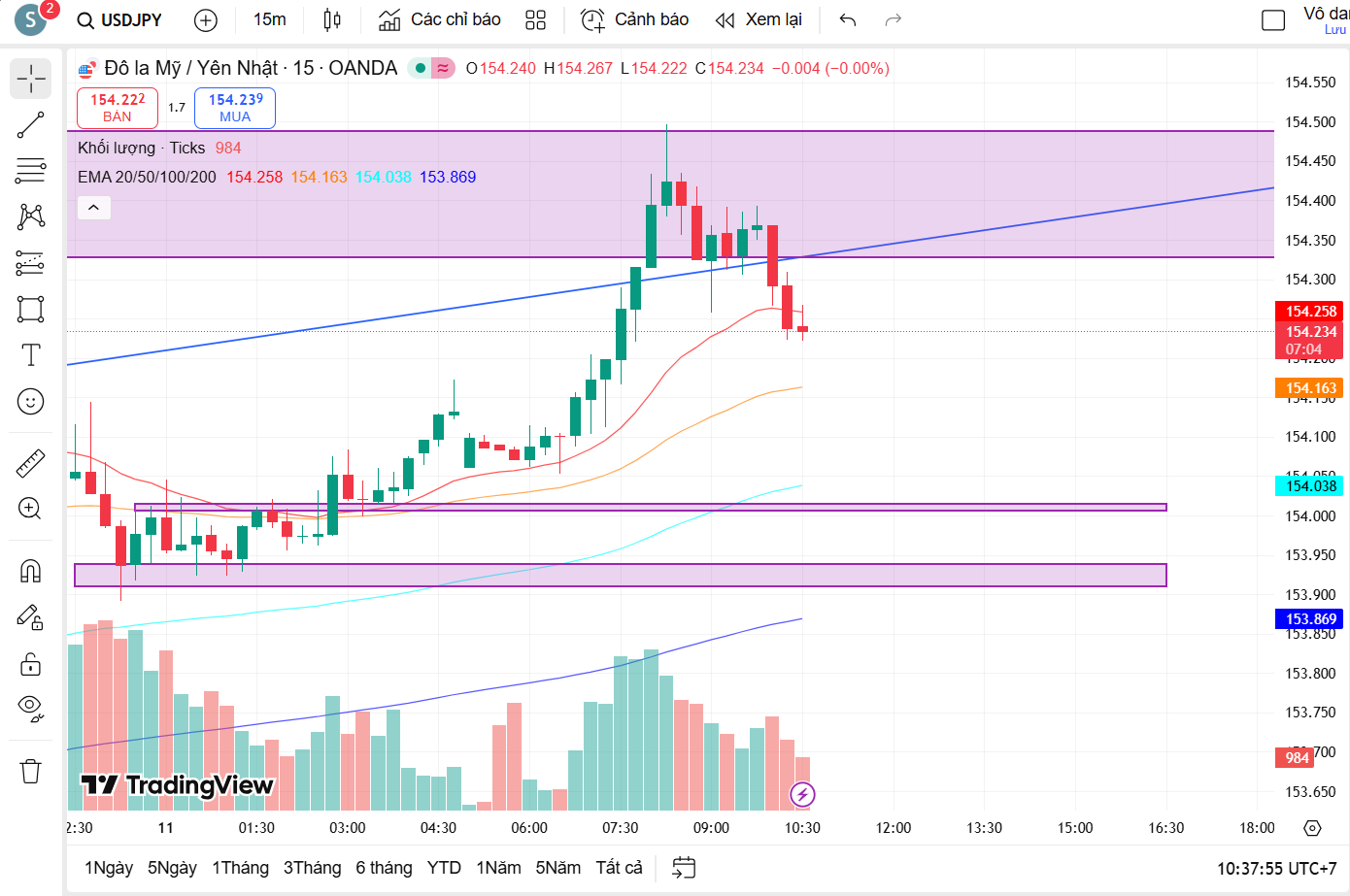 | Vùng vào lệnh | 154.240 - 154.260 | vùng giá gần kháng cự, có thể quay lại kiểm tra (retest) mốc EMA 20 (vạch đỏ, ~154.257) vừa bị phá vỡ. |