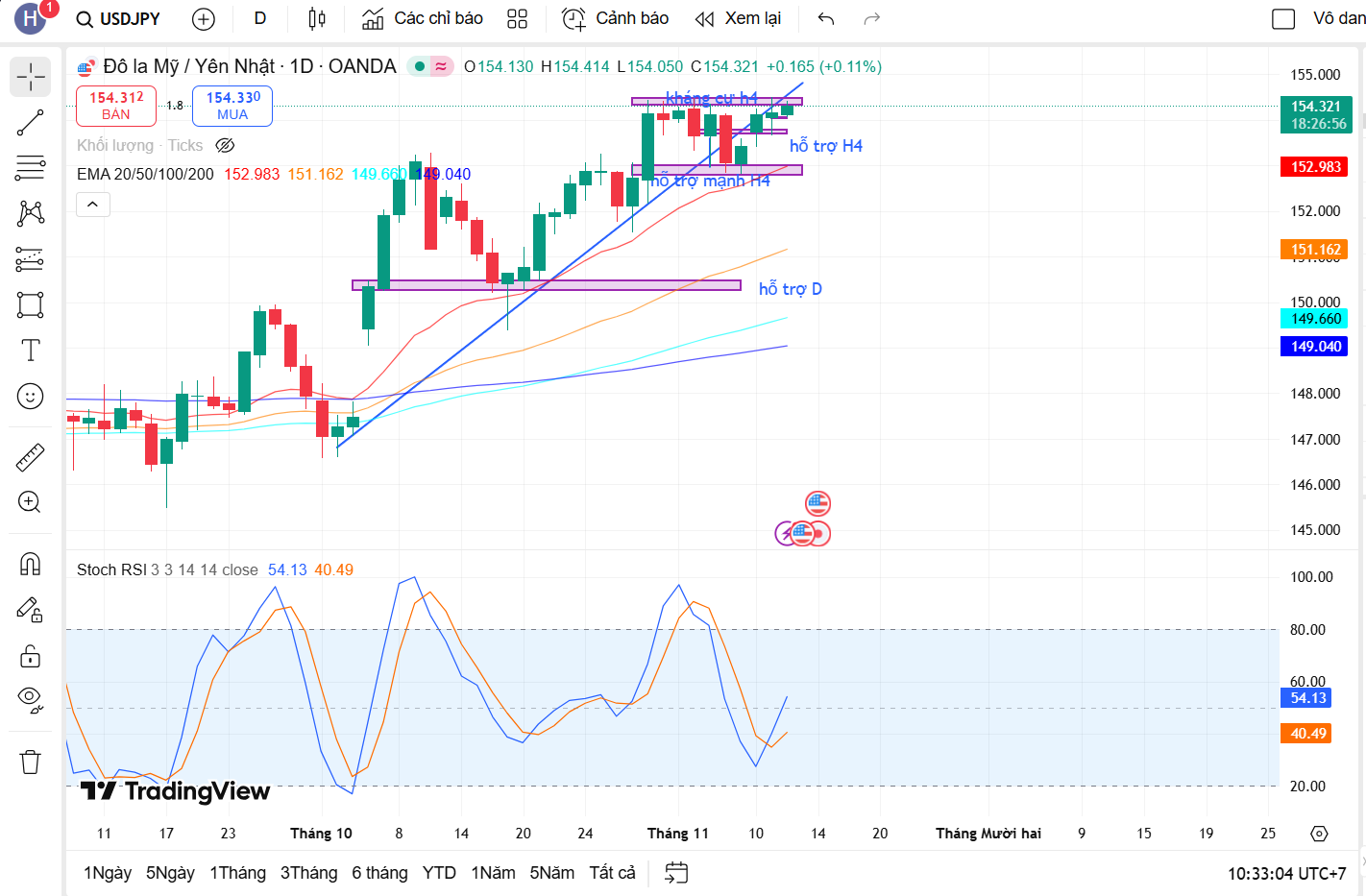 Chuyển sang các góc nhìn ngắn hạn hơn, chỉ số ở khung H4 vẫn thể hiện một xu hướng tăng rõ rệt, được hỗ trợ bởi đường trendline chéo và các đường EMA. Tuy nhiên, giá hiện đang bị "kẹt" tại vùng kháng cự H4 rất mạnh (khoảng 154.300 - 154.400), nơi đã kiểm định thất bại nhiều lần. Đồng thời, chỉ báo Stochastic RSI đang cho thấy tín hiệu động lượng suy yếu, cho thấy thị trường đang chững lại. Nhiều khả năng, thị trường đang chờ một thông tin có sức ảnh hưởng để có lực để giá phá vỡ vùng giá đi ngang này.