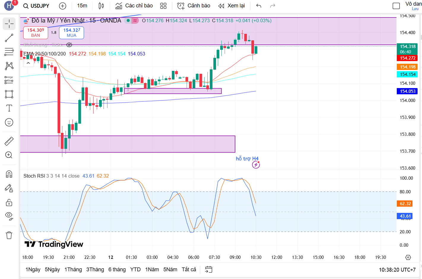 Tuy nhiên, cơ hội dành cho các nhà đầu tư tham gia nhịp ngắn vẫn hiện hữu, ví dụ như ở khung M15. chúng ta thấy rõ hơn hành động giá ngay tại vùng kháng cự H4 (quanh 154.300-154.400). Sau một đợt tăng giá mạnh mẽ vào đầu buổi sáng, giá đã chững lại và đang bắt đầu một nhịp điều chỉnh giảm ngắn hạn và đang tiếp cận đường EMA 20.