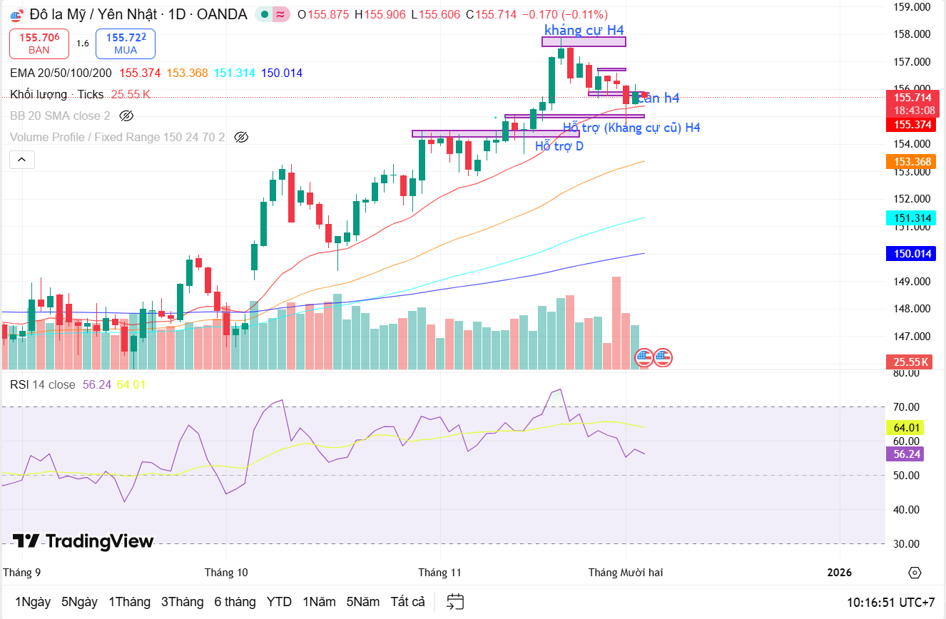 Trên biểu đồ ngày, USD/JPY đang cho thấy nhịp điều chỉnh kĩ thuật sau khi thất bại trong việc chinh phục lại mốc 158.00. Tỷ giá hiện đang giao dịch quanh vùng 155.70, tiệm cận đường trung bình động EMA 20. Mặc dù cấu trúc các đường EMA vẫn đang được giữ vững, chỉ số RSI đã thoái lui từ vùng quá mua xuống mức 56.24 và đang dốc xuống, xác nhận động lượng tăng giá trung hạn đang suy yếu đáng kể.