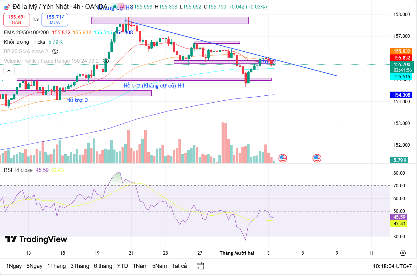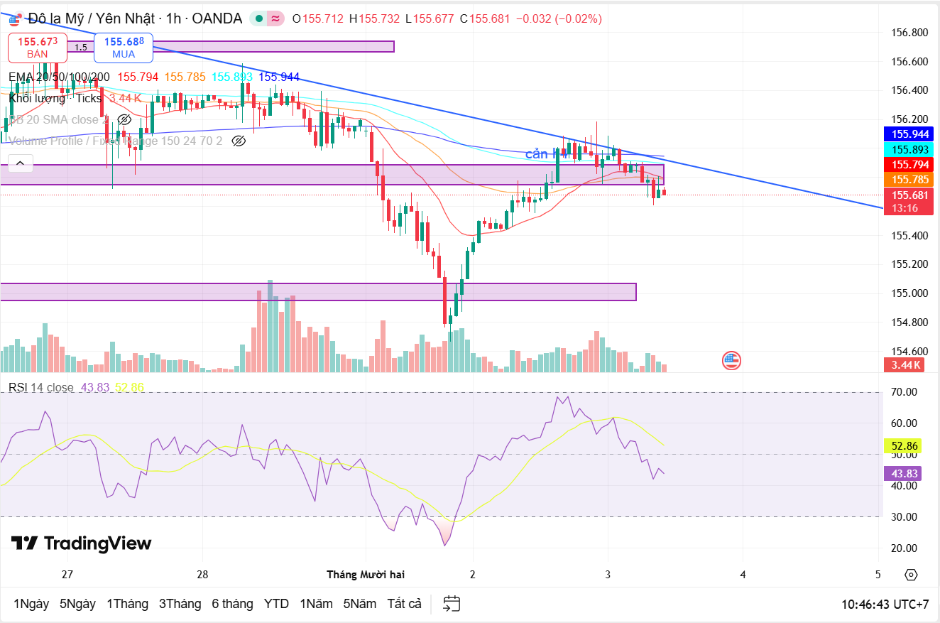 Trên biểu đồ H1, các thông số kỹ thuật phần lớn đang ủng hộ xu hướng giảm điểm. Chỉ báo RSI hiện đang đứng ở mức 43.83, duy trì dưới ngưỡng trung tính 50, cho thấy phe bán đang chiếm ưu thế về động lượng nhưng thị trường vẫn chưa rơi vào trạng thái quá bán. Đáng chú ý, hệ thống các đường trung bình động hàm mũ (EMA) đang có dấu hiệu hội tụ và dốc xuống, với đường EMA 20 và 50 đóng vai trò là kháng cự động ngay phía trên mức giá hiện tại (155.68). Giá vẫn đang di chuyển dưới đường xu hướng giảm, xác nhận cấu trúc giảm giá vẫn được duy trì chặt chẽ.