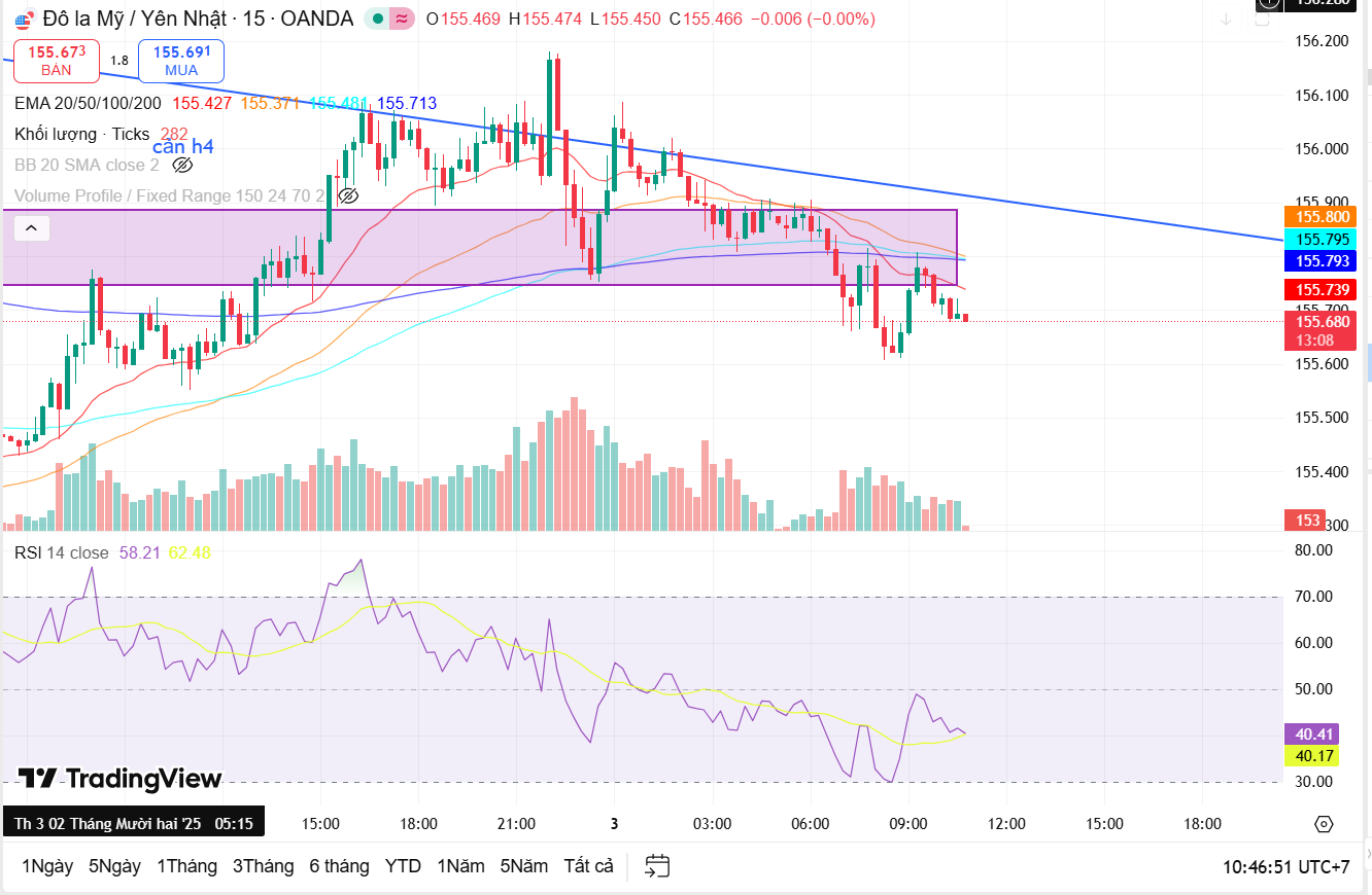 Đi sâu vào khung thời gian 15 phút (M15), tín hiệu suy yếu càng thể hiện rõ qua hành động giá quanh cụm EMA. Mặc dù có sự giằng co, vận đông giá đang có xu hướng liên tục tạo vùng tích lũy dưới đường EMA200, nơi nhiều khả năng sẽ tạo thành một ngưỡng cản kỹ thuật trong ngắn hạn. Chỉ số RSI trên khung này dao động quanh mốc 40, phản ánh lực cầu yếu ớt tại vùng giá hiện tại. Sự đồng thuận của chỉ báo RSI dưới mức 50 và vị thế giá nằm dưới các đường trung bình động quan trọng trên cả hai khung H1 và M15 cho thấy xác suất cao giá sẽ tiếp tục kiểm định lại vùng hỗ trợ gần nhất quanh 155.00 - 155.15.