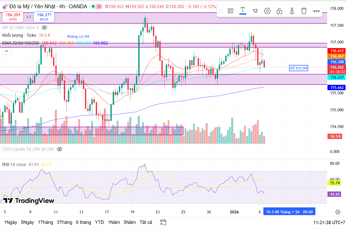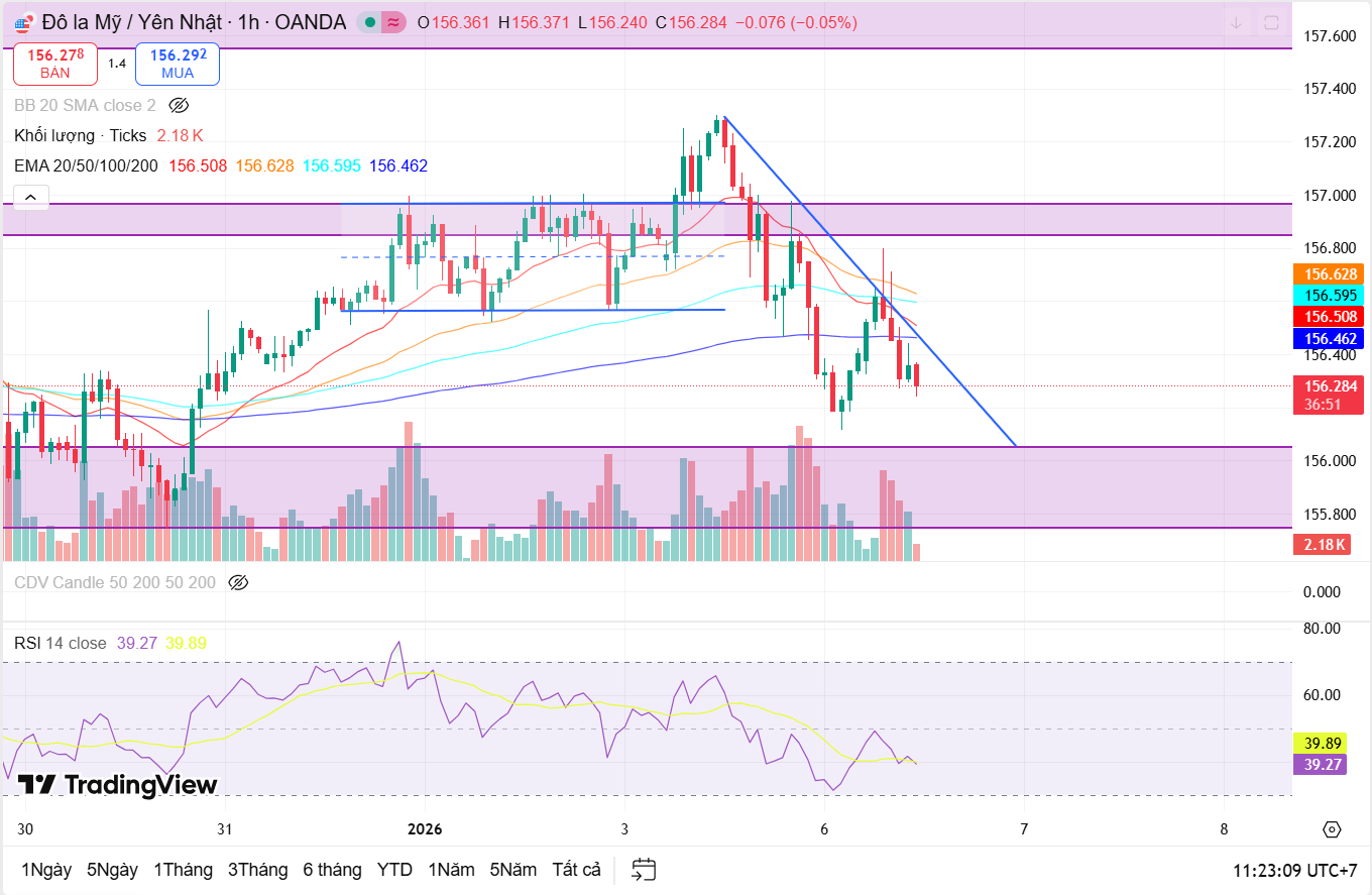 Trên phương diện kỹ thuật, cấu trúc giá ngắn hạn cho thấy áp lực giảm vẫn chiếm ưu thế, với các nhịp hồi liên tục bị bán xuống và giá đang dao động sát vùng hỗ trợ quan trọng quanh 156.0. Trong bối cảnh chưa xuất hiện tín hiệu đảo chiều rõ ràng, USD/JPY nhiều khả năng sẽ tiếp tục biến động thận trọng, ưu tiên kịch bản giằng co – điều chỉnh trước khi thị trường xác nhận xu hướng mới rõ ràng hơn.