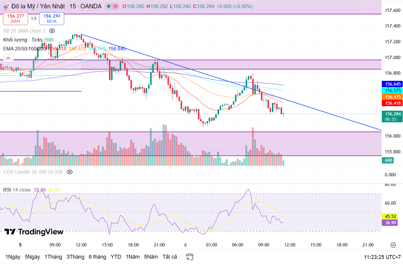 Trên khung H1, cấu trúc giảm ngắn hạn được củng cố bởi việc giá vận động dưới một đường xu hướng giảm rõ ràng. Các nhịp hồi phục trong phiên đều bị bán xuống khi tiếp cận vùng 156.6 – 156.8, cho thấy áp lực cung vẫn đang kiểm soát các nhịp hồi. RSI H1 duy trì dưới mốc 40–45 phản ánh lực mua yếu, và các cú bật lên hiện tại mang tính kỹ thuật nhiều hơn là sự đảo chiều xu hướng thực sự.