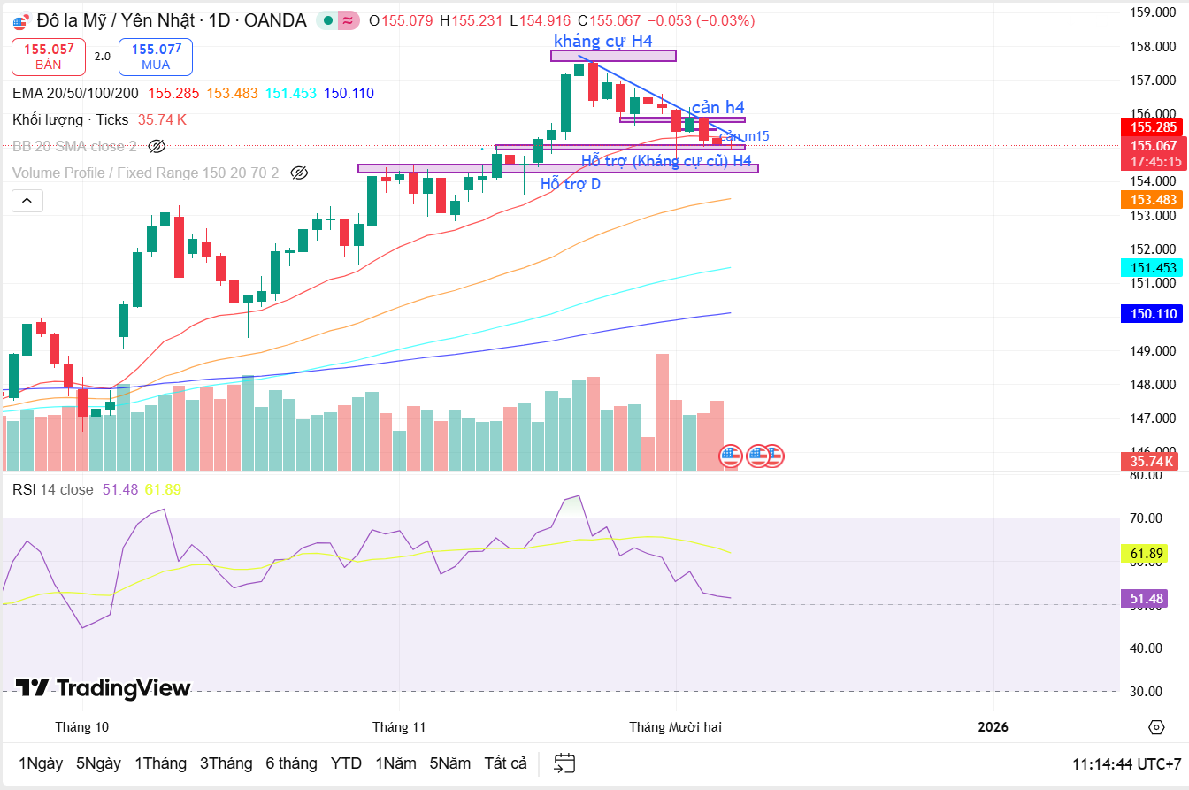 Đi sâu vào khung thời gian H4, bức tranh kỹ thuật đang nghiêng hẳn về phía phe bán. Giá hiện đang bị kẹp trong mô hình nêm giảm với biên dưới là vùng hỗ trợ cứng 154.40 - 154.50. Đáng chú ý, cụm các đường EMA 20-50-100 trên khung H4 đang hội tụ tại vùng 155.60 - 156.00, hình thành vùng kháng cự động.