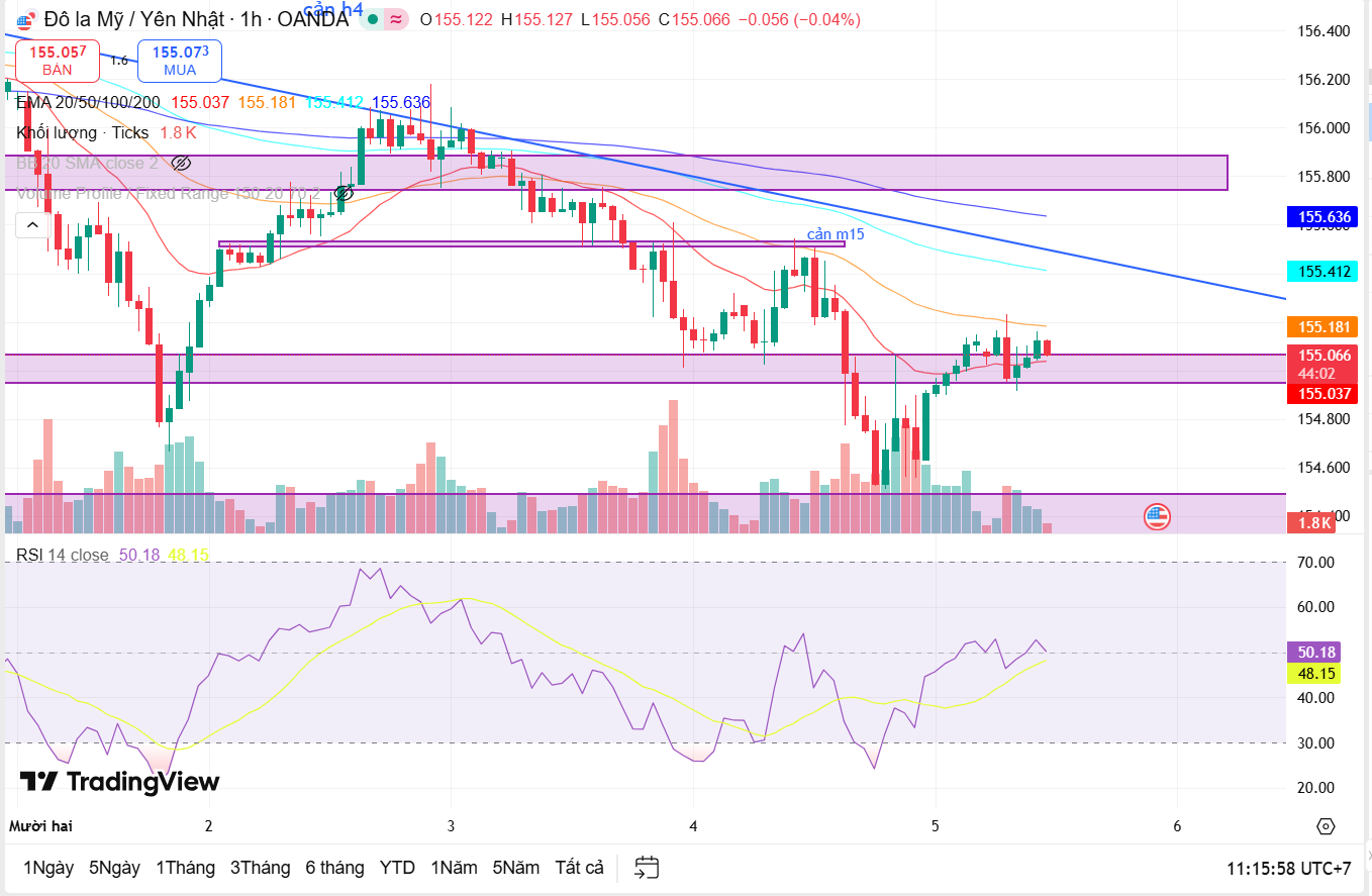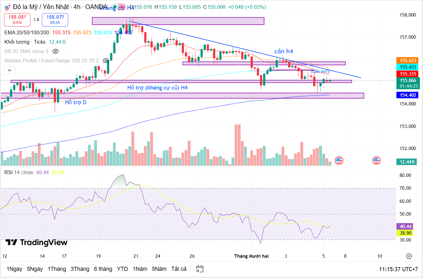Tại các khung thời gian nhỏ hơn như H1 và M15, thị trường đang trong trạng thái tích lũy. Giá đang liên tục test lại các đường EMA 20 và 50 trên H1 nhưng chưa thể bứt phá, cho thấy áp lực cung phía trên vùng 155.20 - 155.30 vẫn rất dày đặc. Tuy nhiên, việc xuất hiện nhiều râu nến dưới tại vùng 154.80 cũng cảnh báo các nhà đầu tư cần thận trọng với những bẫy giá trước khi xu hướng chính được xác nhận.