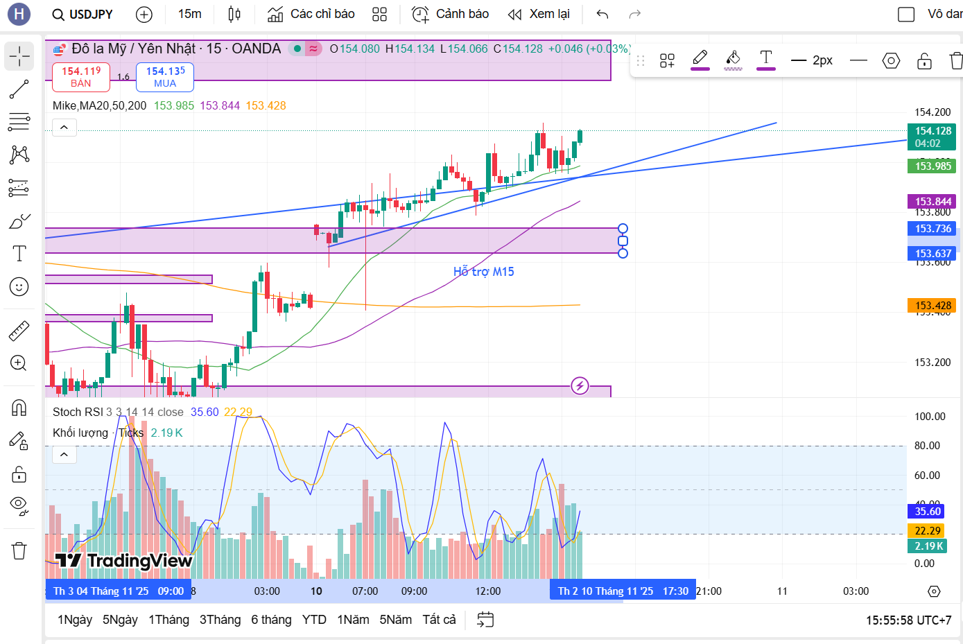 Nếu phân tích kĩ hơn ở khung giá 15 phút, đường xu hướng tăng ngắn hạn đã được hình thành và lực bán vẫn đang chiếm ưu thế khi các đường MA ngắn và trung hạn đã vượt lên trên đường MA dài hạn. Với việc chỉ số Stoch RSI đã thoát ra khỏi vùng quá bán và các cây nên thân dài liên tục xuất hiện, nhiều khả năng đường xu hướng này sẽ được giữ vững cho đến hết ngày.