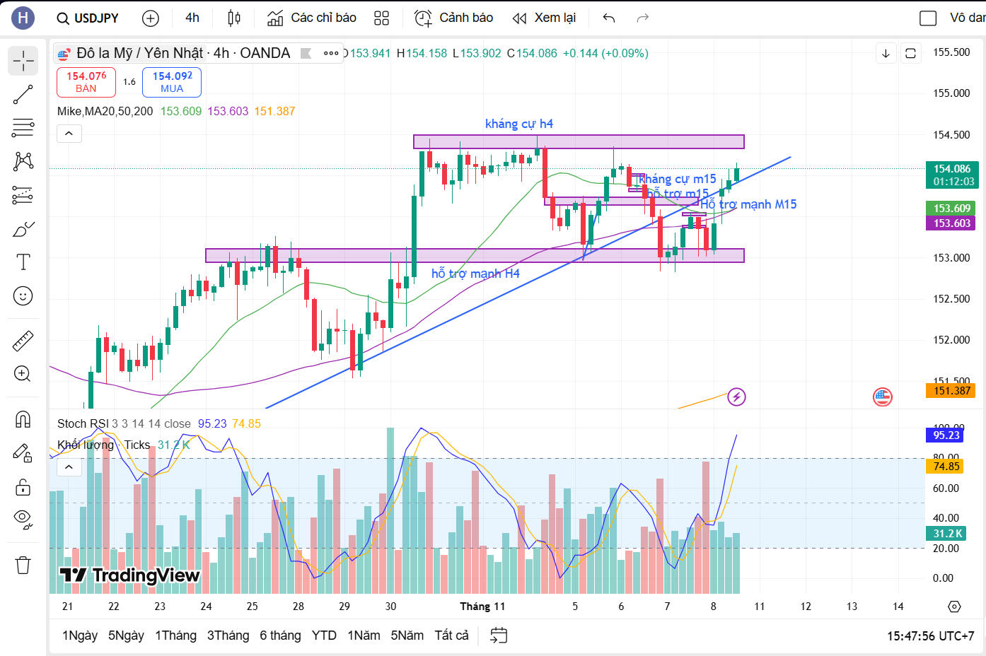 Ở thời điểm bài viết đang được thực hiện, tỷ giá USD/JPY đang được neo ở quanh vùng 154.0, ghi nhận mức tăng gần 0.25% kể từ đầu ngày. Về mặt kĩ thuật, chỉ số đang bất ngờ quay về đường xu hướng dài hạn sau ghi rơi xuống vùng hỗ trợ 152.9-153.1 cuối tuần trước.