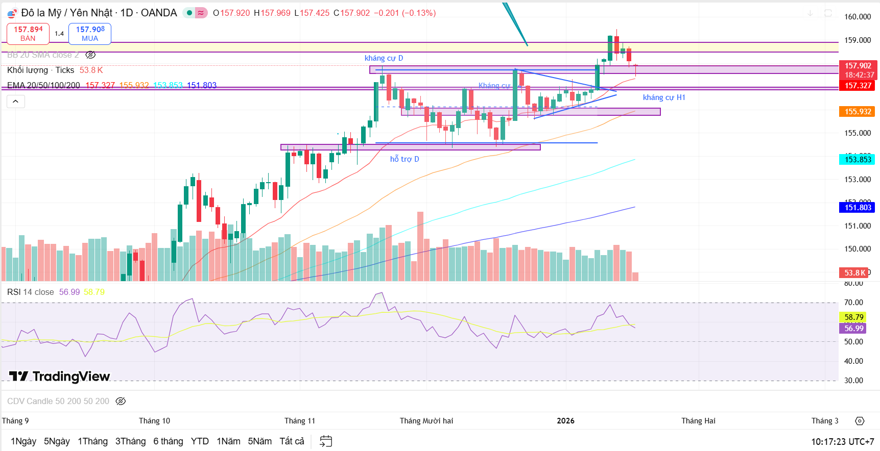 Trên khung ngày, USDJPY vẫn duy trì cấu trúc tăng trung hạn, thể hiện qua việc giá nằm phía trên các đường EMA dài hạn (EMA100 và EMA200), đồng thời các nhịp điều chỉnh trước đó đều được hấp thụ khá tốt. Tuy nhiên, cần lưu ý rằng sau cú tăng mạnh lên vùng 159, giá đã bị từ chối rõ ràng tại kháng cự ngày, hình thành các nến giảm liên tiếp và quay trở lại kiểm tra vùng cân bằng phía dưới.