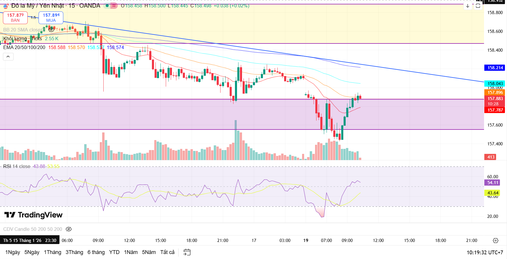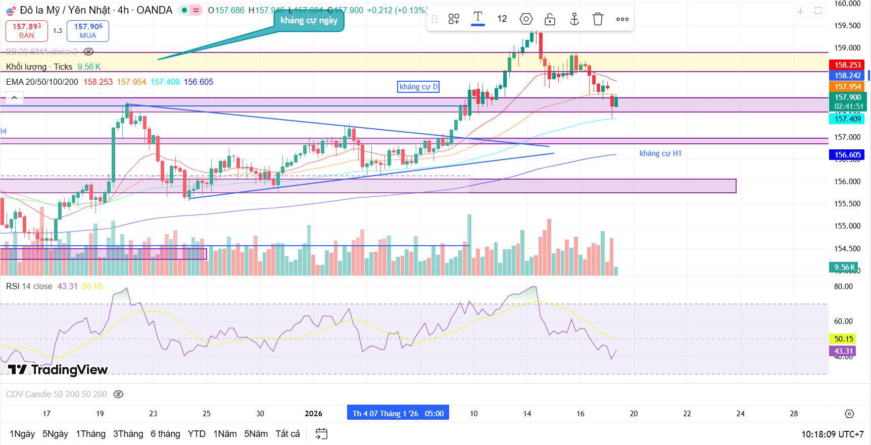 Ở khung H4, bức tranh trở nên rõ ràng hơn về mặt cấu trúc điều chỉnh. Sau khi tạo đỉnh quanh vùng 159, USDJPY đã phá vỡ cấu trúc tăng ngắn hạn, trượt xuống dưới EMA20 và EMA50, đồng thời quay về kiểm tra vùng hỗ trợ quan trọng quanh 157.6 – 157.9. Đây là vùng đã nhiều lần đóng vai trò hỗ trợ/kháng cự trong quá khứ, nên phản ứng giá tại đây mang ý nghĩa then chốt.