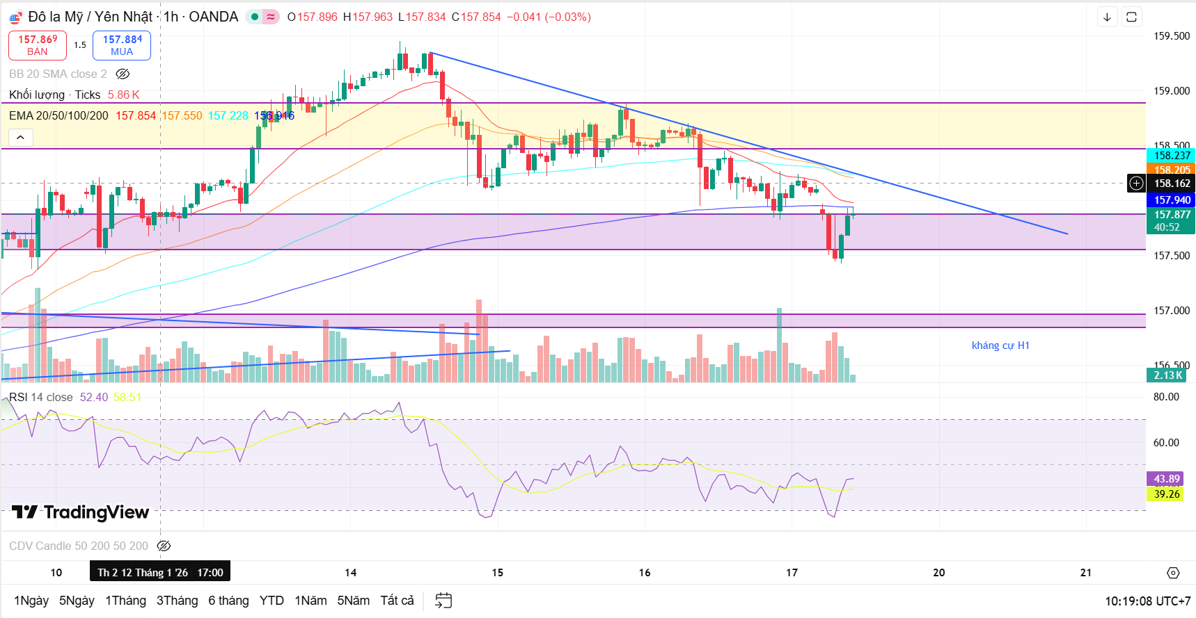 RSI H4 hiện nằm dưới mốc 50 và chưa cho thấy sự phục hồi mạnh, phản ánh rằng lực bán trung hạn vẫn còn hiện diện. Tuy nhiên, việc giá vẫn giữ được trên EMA100 cho thấy phe mua chưa hoàn toàn mất kiểm soát. Kịch bản H4 thiên về giằng co trong biên, với hai đầu mút chính là vùng kháng cự 158.4 – 158.8 phía trên và vùng hỗ trợ 157.5 – 157.6 phía dưới.