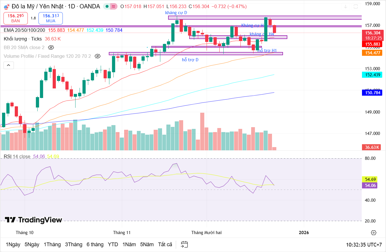 Trong phiên giao dịch hôm nay, USD/JPY tiếp tục duy trì dao động ở vùng giá cao, phản ánh quán tính tăng còn sót lại từ các phiên trước đó. Mặc dù lịch kinh tế ghi nhận khá nhiều dữ liệu được công bố trong ngày, phần lớn các chỉ báo này – bao gồm PCE, GDP sơ bộ hay niềm tin tiêu dùng – đều được thị trường đánh giá là không đủ sức tạo ra thay đổi mang tính xu hướng, đặc biệt trong bối cảnh thanh khoản vào những ngày nghỉ cuối năm sẽ suy giảm rõ rệt.